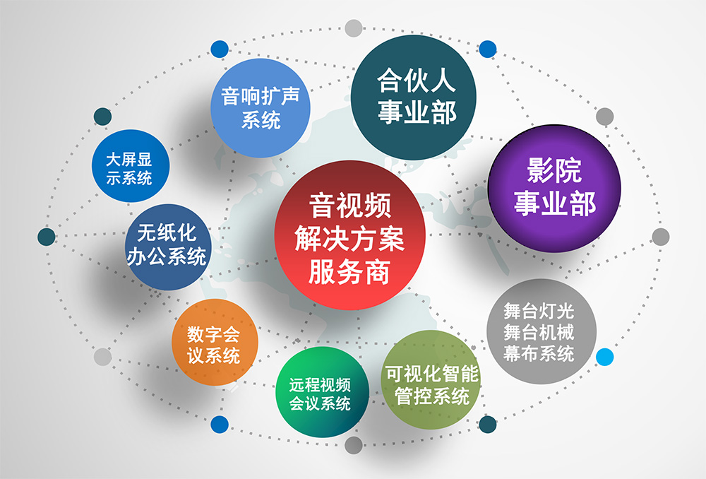 企業(yè)以音視頻解決方案服務(wù)和英嘉尼影院品牌為戰(zhàn)略方向,努力為全國128個(gè)城市提供專業(yè)化音視頻產(chǎn)品。