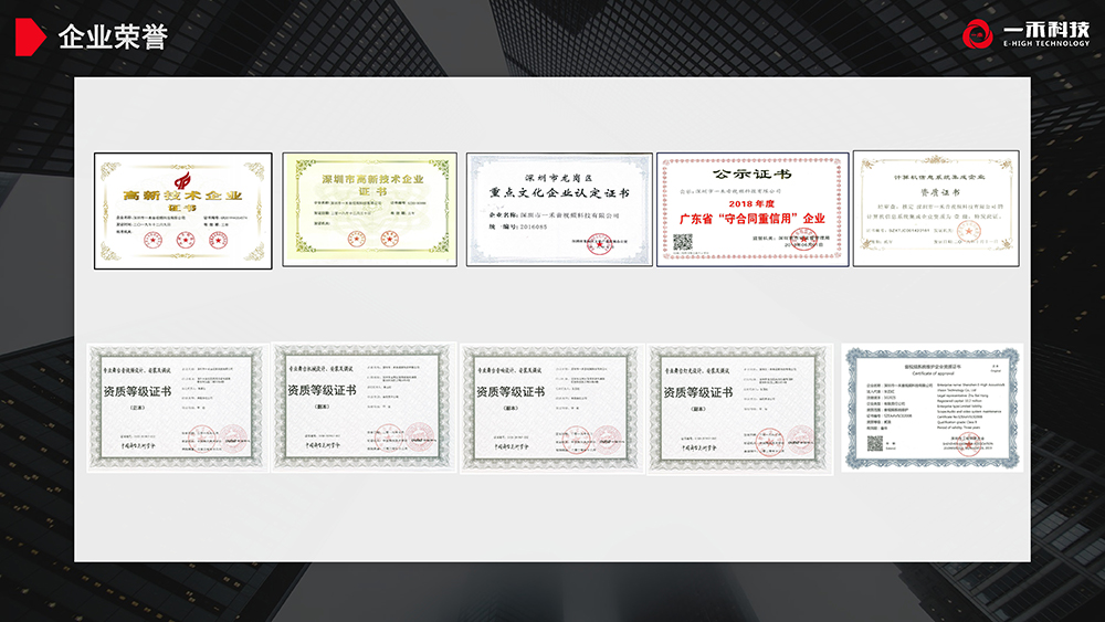 深圳市一禾音視頻科技有限公司創(chuàng)立于2001年,為國家高新技術(shù)企業(yè),深圳市高新技術(shù)企業(yè),重點(diǎn)文化企業(yè),廣東省守合同重信用企業(yè),通過了國家貫標(biāo)知識產(chǎn)權(quán)體系認(rèn)證、ISO9001質(zhì)量管理體系認(rèn)證、ISO14001環(huán)境管理體系認(rèn)證、OHSAS18001職業(yè)健康管理體系認(rèn)證。