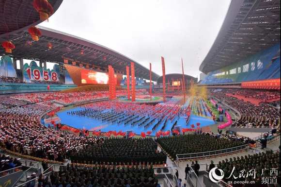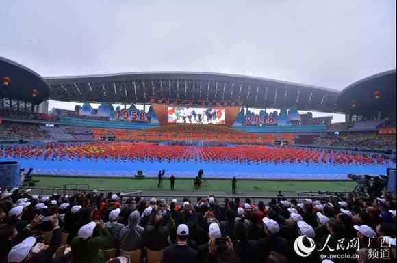 12月10日的南寧花團錦簇、喜氣盈城,處處洋溢著歡樂喜慶的節(jié)日氣氛。約2.2萬名身著盛裝的各族各界干部群眾,歡聚在廣西體育中心,共同慶祝盛大的日子。主席臺上方,用壯、漢兩種文字書寫著“廣西壯族自治區(qū)成立60周年慶祝大會”橫幅。表達了各族人民的共同心聲?!敖ㄔO壯美廣西共圓復興夢想”12個大字高懸,兩側(cè)“1958”“2018”字樣格外醒目。