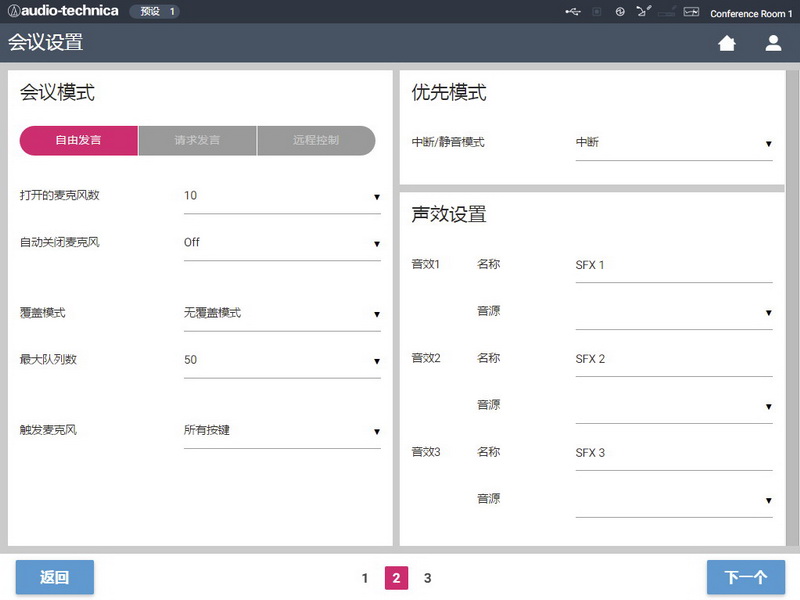 與常規手拉手會議系統一樣,ATUC-50系統也設有多種發言模式,如“自由發言”、“請求發言”、“遠程控制”以及各種“覆蓋設置”模式和靈活的“聲控觸發”模式。